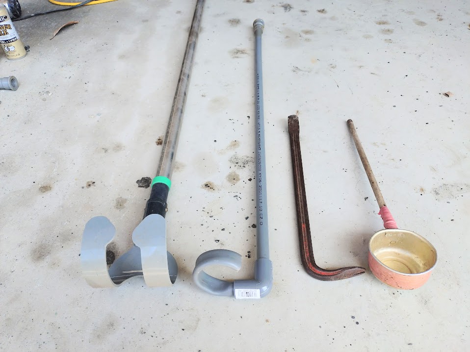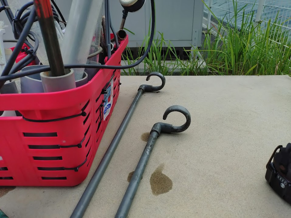 右から「柄杓」 「バール」 「弊社自作小道具(これは多分日本全国探してもうちにしかない)」 「関西化工謹製フロートキャッチャー様」です。