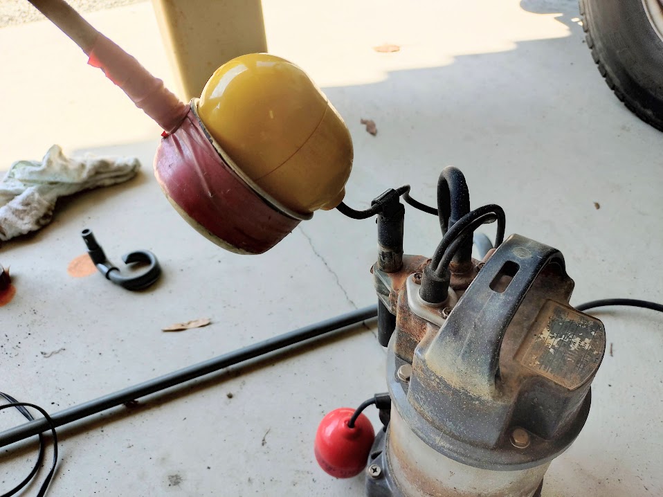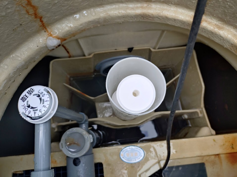 柄杓でフロート上げるとこんな感じ。10年くらい前までは弊社もこのパターンでやっていましたが、柄杓が大きかろうが小さかろうがとにかくやりにくい。上下のフロートを同時に上げて動作確認したいときなんかはメチャクチャ難儀します。