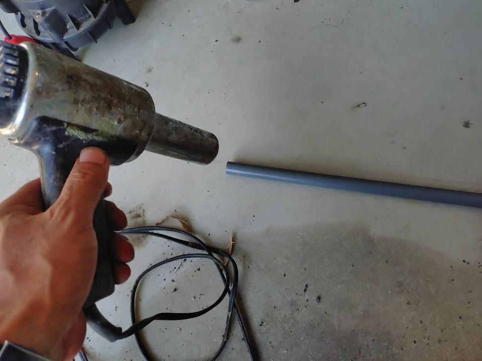 まず、ヒートガンで13mmの塩ビ管の先端20cmをフニャフニャになるまで2~3分ヒートガンで温めます。