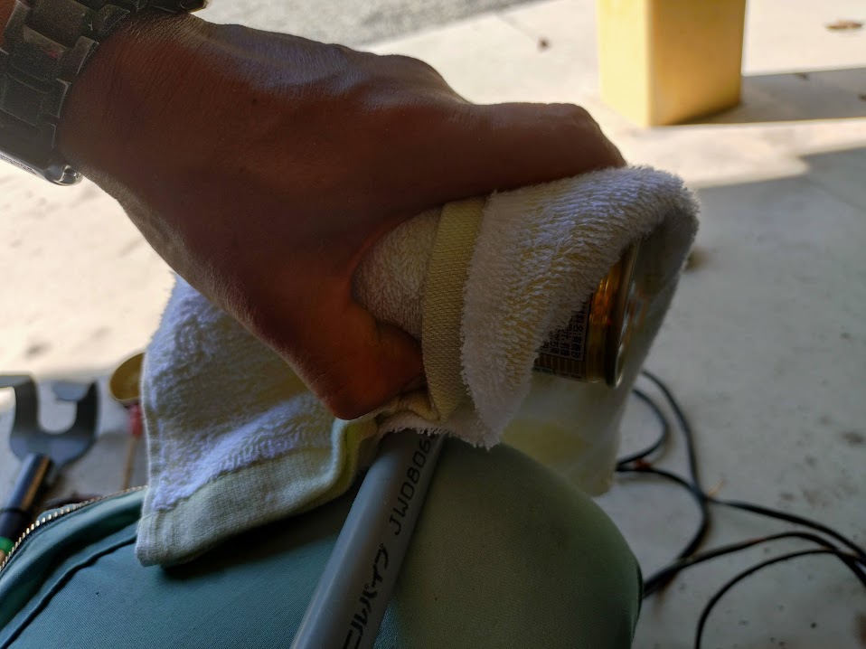 塩ビ管がフニャフニャのうちに適当な太さのジュースの缶に巻き付けてタオルで押さえます。