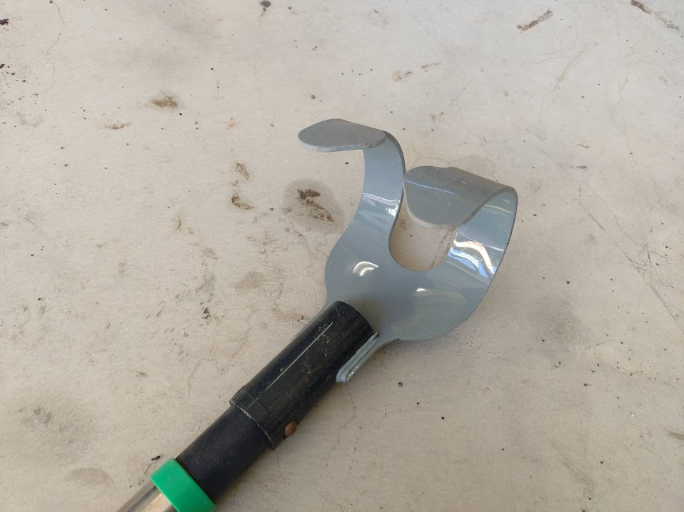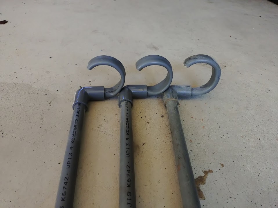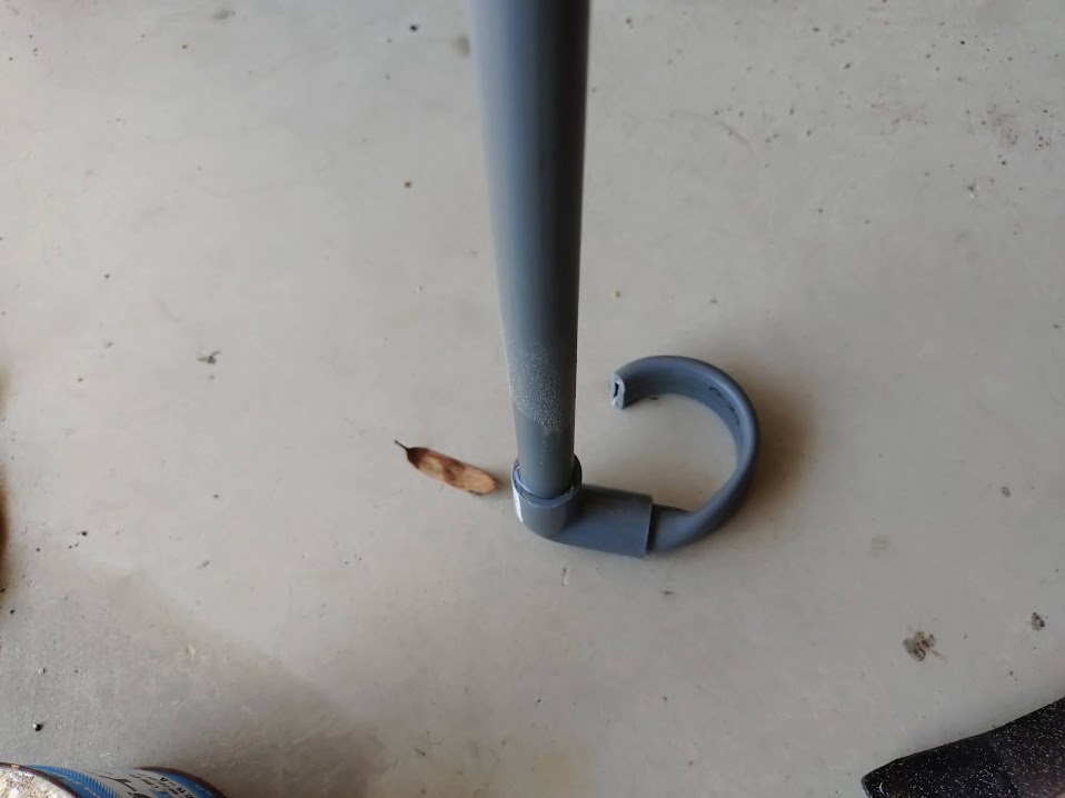 造りはチョ~簡単。塩ビの板をU字にカットしたものを熱を加えて曲げて塩ビソケットに差し込んでグルーガンで接着。それを伸縮物干しざおの片端に突っ込んでピンで固定。以上。