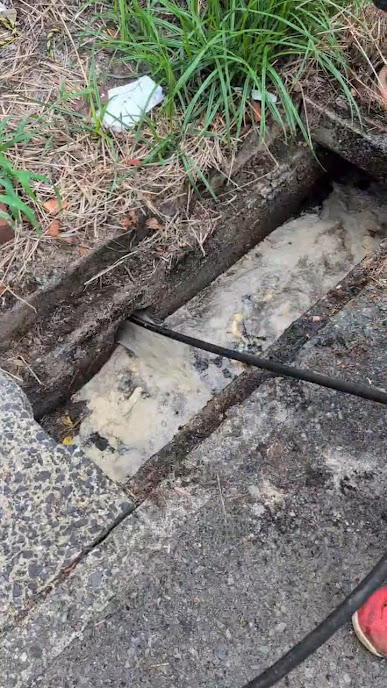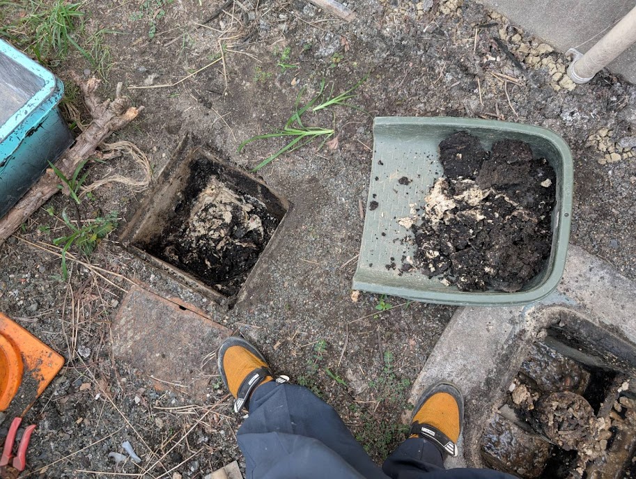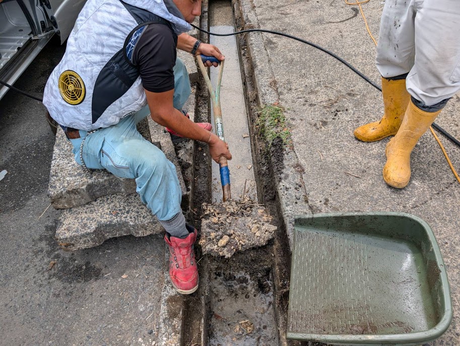 放流先がこんな状態だとどうしようもないので、放流管周辺の側溝の蓋を外して土砂とラーメンの脂が固まったものを(完全に汚泥やん🆖)取り除きます。土砂がたまってるところが50mくらい延々と続いてるので放流管周辺の土砂しか取ってません。・・・こんなになっても放置されてるとはこれ如何に?