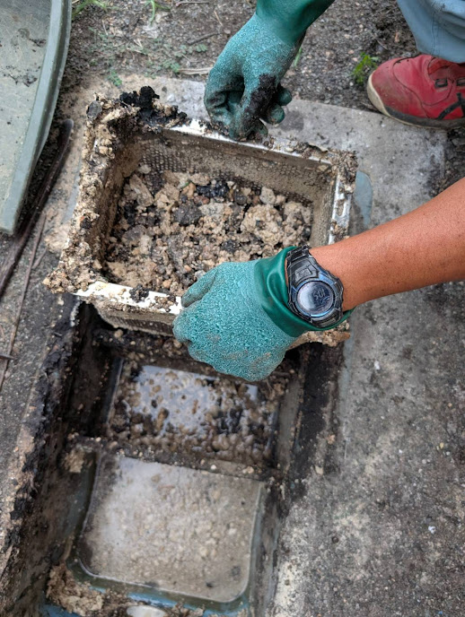 現場に行ってみたらグリストラップの中が脂でミッチミチ💧(写真は既にグリスを崩した後)