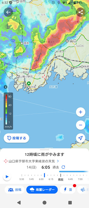 そして翌朝日曜日。せっかくゆっくり寝れると思ってたのにいつの間にかこんな雨が宇部市を通過しており、6:00に警報でたたき起こされ・・・